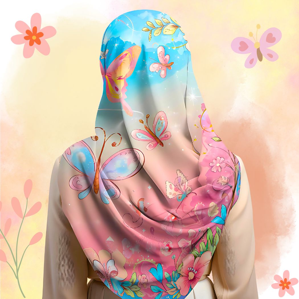 Hijab Premium Motif Motif Bunga dan Kupu-kupu Exclusive dengan kualitas bahan yang berkualitas lembut ,halus dan tidak transparan.
